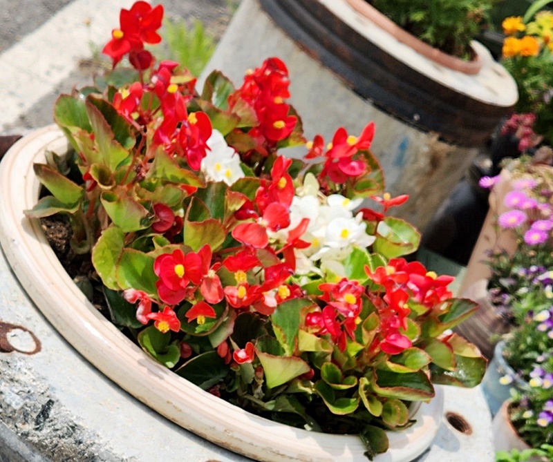 베고니아의 종류는 다양하지만 여기서 언급하는 베고니아는 사철베고니아로써 봄부터 가을까지 쉬지 않고 꽃을 피웠습니다. 이 꽃은 주로 붉은색, 핑크색, 흰색 등 다양한 색상의 꽃잎을 가지고 있으며 품종에 따라 햇볕과 온도, 물 등 다양한 환경을 요구하는 종류로 우리가 키우고 있는 베고니아는 햇살 풍부한 실외 공간에서 지금까지 잘 자라는 사철베고니아입니다. 빨간색과 흰색의 예쁘고 작은 사철베고니아는 추위에 약하여 지금은 실내로 들여서 자라고 있습니다.