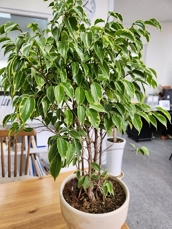 우리는 사무실 안이라 춥지 않게 겨울을 날 수 있는 벤자민 나무를 볼 수 있으며 실내의 공기 오염을 정화시켜 주기 때문에